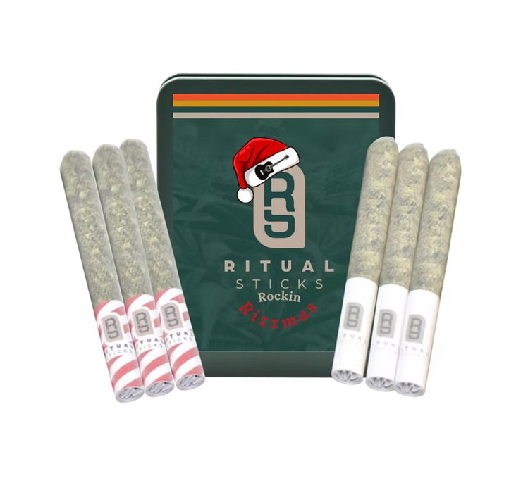 Let's do the rolling so you can the holidays, Rockin Rizzmas is your ready to go pre-roll pack, featuring three Rockstar Kush and three Strawberry Rizz, crafted for cozy nights in or chilled out celebrations. Rolled with 100% whole flower, no trim, no shake, these Ritual Sticks preserve the full flavor and potency of both cultivars. Hand rolled in a straight slim paper for a consistent and smooth experience delivering a mix of relaxation and cheer. Perfect for sharing, gifting, or keeping it all to yourself.